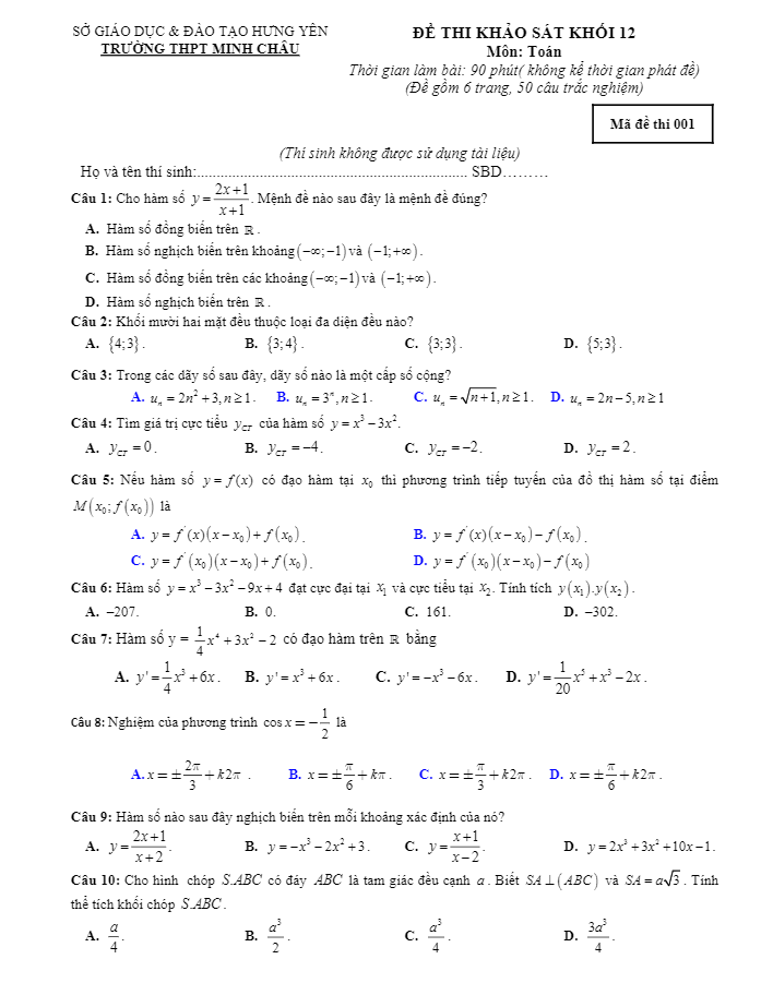 Đề Thi Thử THPT Môn Toán Đề thi khảo sát Toán 12 năm học 2018 – 2019 trường THPT Minh Châu – Hưng Yên 15/10/2018