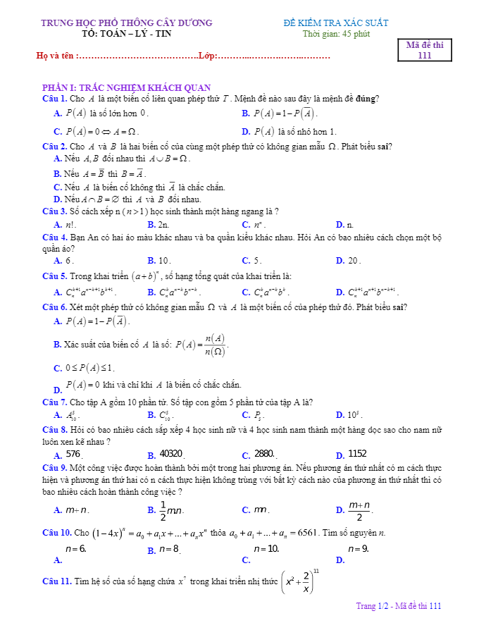 Kiểm Tra ĐS Và GT 11 Chương 2 Đề kiểm tra 1 tiết Đại số và Giải tích 11 chương 2 trường Cây Dương – Kiên Giang 08/11/2018