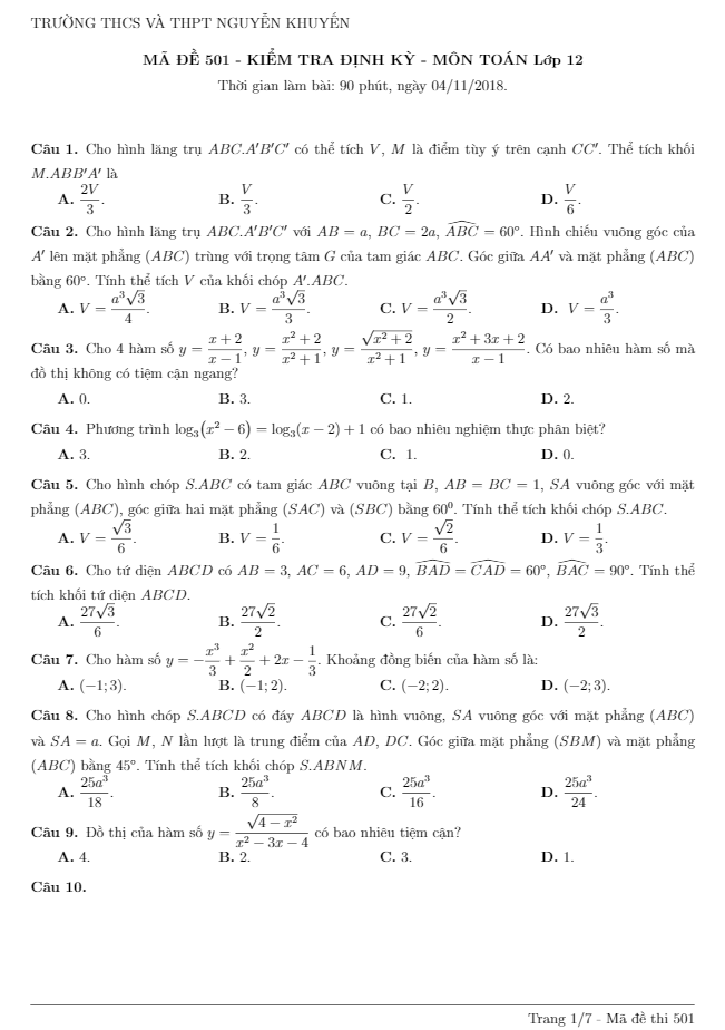 Đề Thi Thử THPT Môn Toán Đề kiểm tra định kỳ Toán 12 năm 2018 – 2019 trường Nguyễn Khuyến – TP. HCM lần 5 05/11/2018