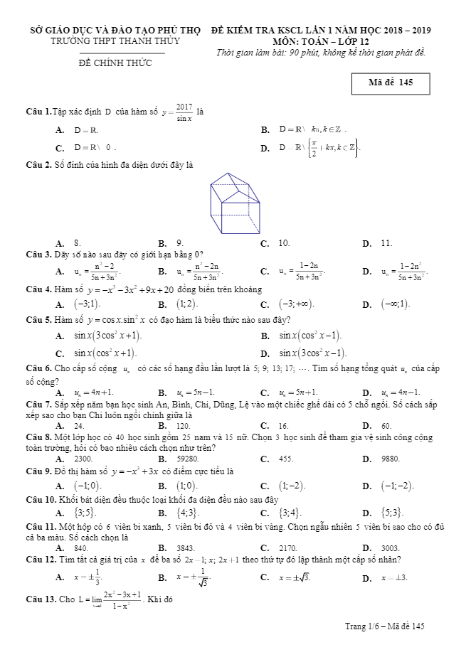 Đề Thi Thử THPT Môn Toán Đề kiểm tra KSCL Toán 12 năm 2018 – 2019 trường Thanh Thủy – Phú Thọ lần 1 05/11/2018
