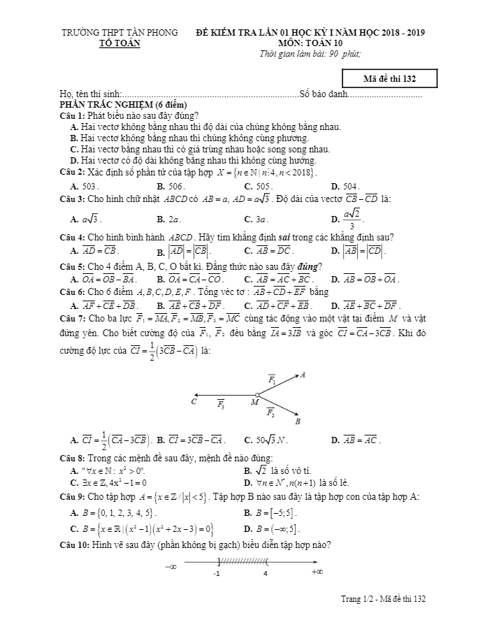Khảo Sát Chất Lượng Toán 10 Đề kiểm tra lần 1 học kỳ 1 Toán 10 năm 2018 – 2019 trường THPT Tân Phong – Bạc Liêu 06/11/2018
