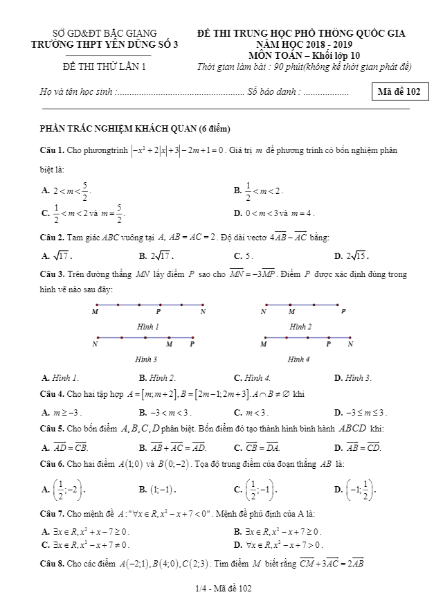 Khảo Sát Chất Lượng Toán 10 Đề thi THPT Quốc gia môn Toán 10 năm 2018 – 2019 trường Yên Dũng 3 – Bắc Giang lần 1 05/11/2018