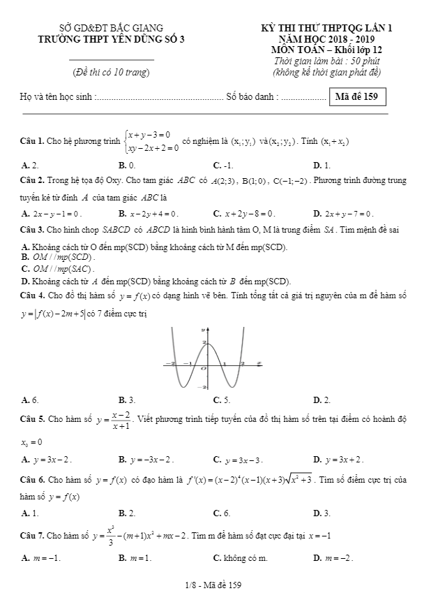 Đề Thi Thử THPT Môn Toán Đề thi thử THPT Quốc gia môn Toán 12 năm 2018 – 2019 trường Yên Dũng 3 – Bắc Giang lần 1 05/11/2018