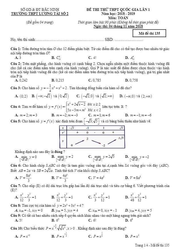 Đề Thi Thử THPT Môn Toán Đề thi thử Toán THPT Quốc gia năm 2018 – 2019 trường Lương Tài 2 – Bắc Ninh lần 1 05/11/2018