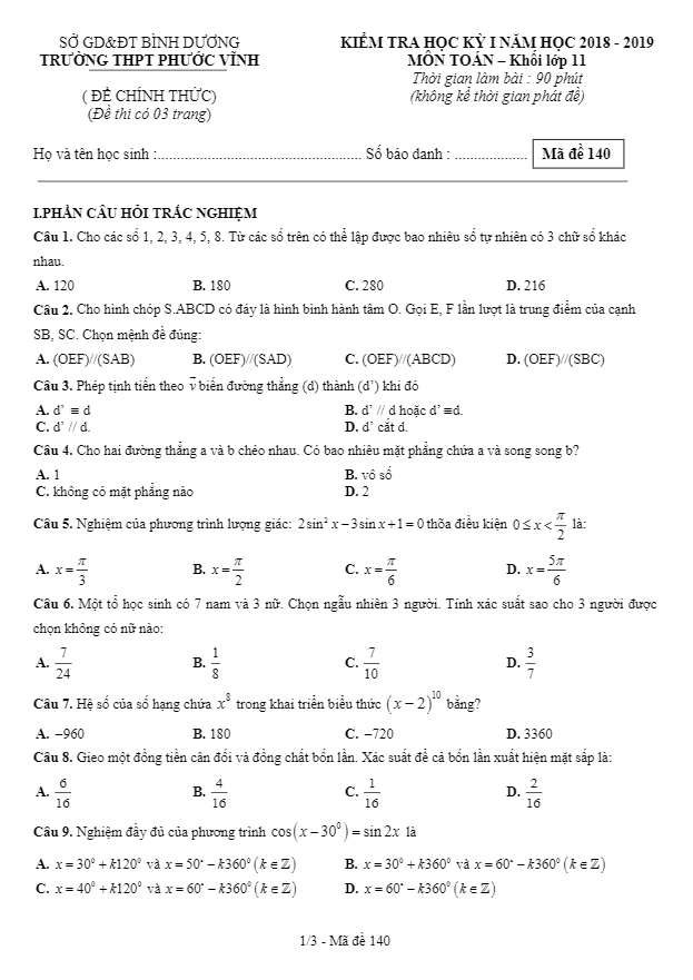 Đề Thi HK1 Toán 11 Đề kiểm tra học kỳ 1 Toán 11 năm 2018 – 2019 trường Phước Vĩnh – Bình Dương 19/12/2018