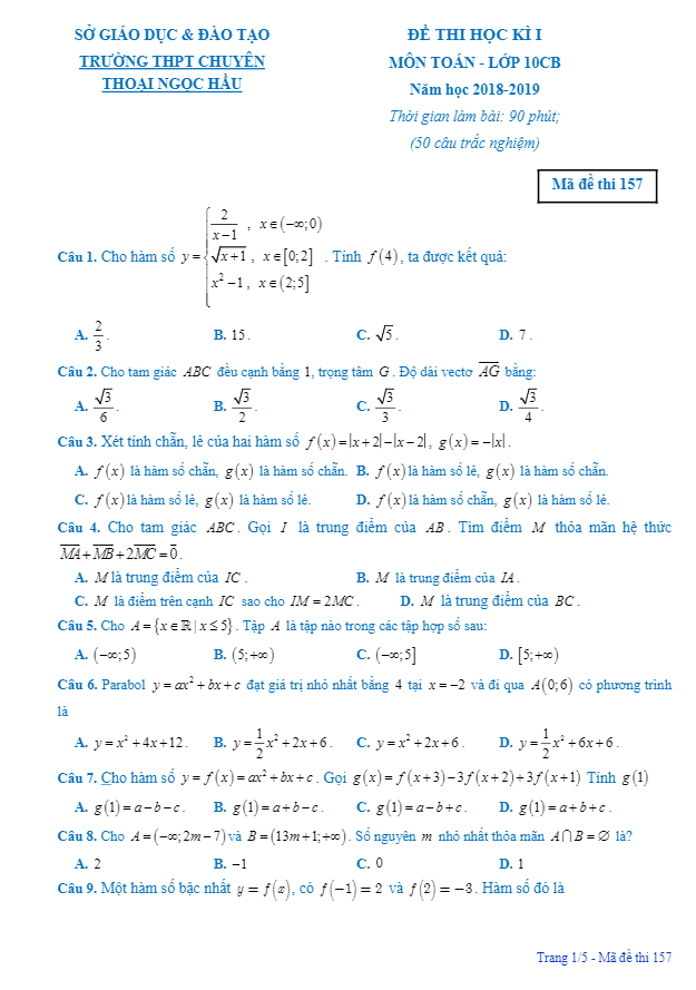 Đề Thi HK1 Toán 10 Đề thi HK1 Toán 10 CB năm 2018 – 2019 trường chuyên Thoại Ngọc Hầu – An Giang 21/12/2018