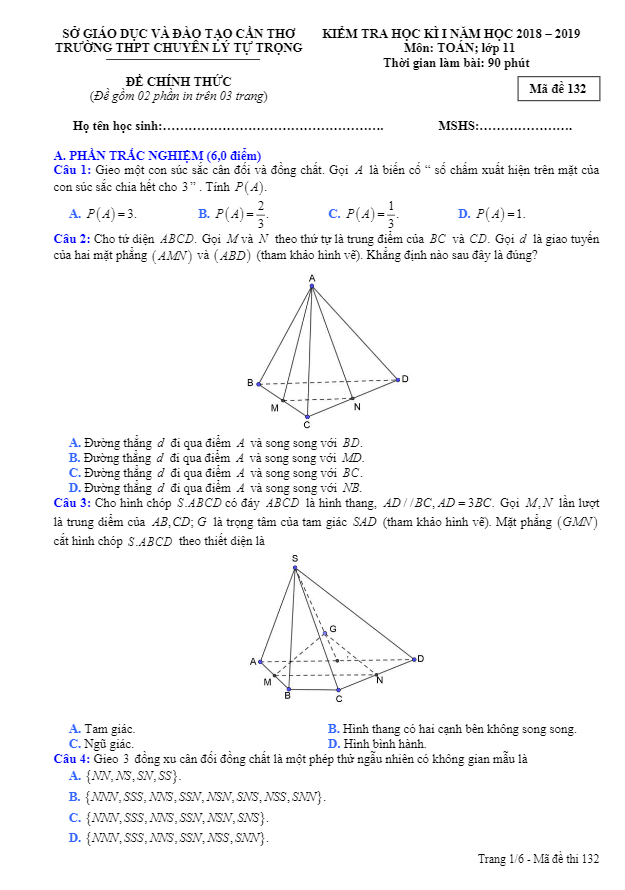 Đề Thi HK1 Toán 11 Đề thi HK1 Toán 11 năm học 2018 – 2019 trường THPT chuyên Lý Tự Trọng – Cần Thơ 21/12/2018