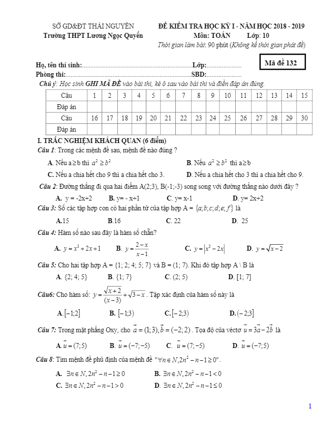 Đề Thi HK1 Toán 10 Đề thi HKI Toán 10 năm 2018 – 2019 trường Lương Ngọc Quyến – Thái Nguyên 21/12/2018