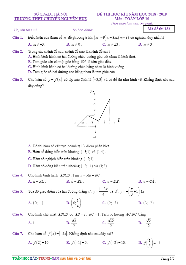 Đề Thi HK1 Toán 10 Đề thi học kỳ 1 Toán 10 năm học 2018 – 2019 trường THPT chuyên Nguyễn Huệ – Hà Nội 20/12/2018