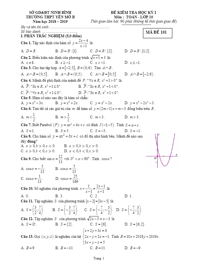 Đề Thi HK1 Toán 10 Đề thi học kỳ 1 Toán 10 năm học 2018 – 2019 trường Yên Mô B – Ninh Bình 21/12/2018