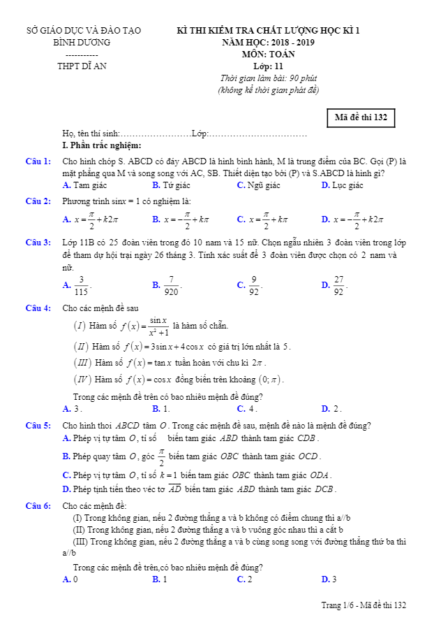Đề Thi HK1 Toán 11 Đề thi học kỳ 1 Toán 11 năm học 2018 – 2019 trường THPT Dĩ An – Bình Dương 21/12/2018