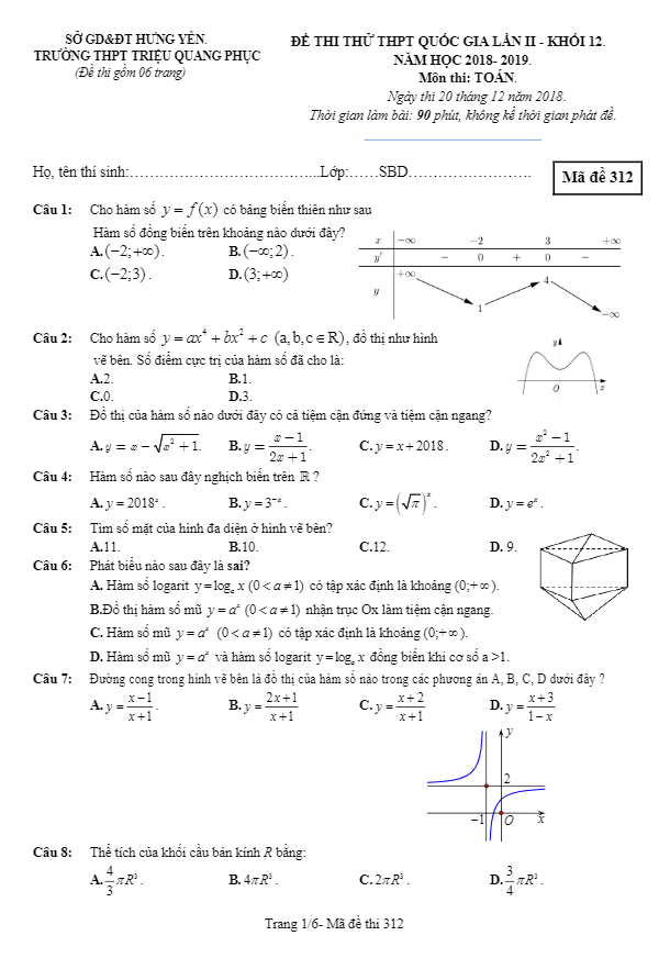 Đề Thi Thử THPT Môn Toán Đề thi thử Toán THPT Quốc gia 2019 trường Triệu Quang Phục – Hưng Yên lần 2 21/12/2018