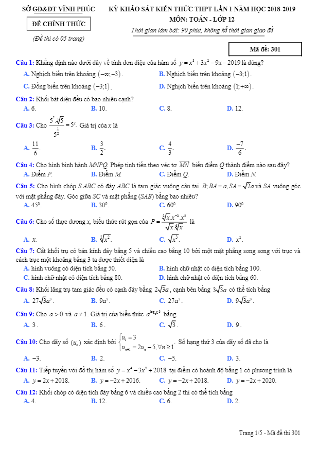 Đề Thi Thử THPT Môn Toán Đề khảo sát kiến thức môn Toán THPT lần 1 năm 2018 – 2019 sở GD và ĐT Vĩnh Phúc 16/12/2018