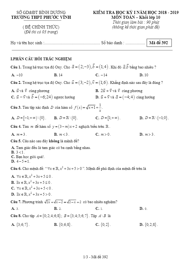 Đề Thi HK1 Toán 10 Đề kiểm tra học kỳ 1 Toán 10 năm 2018 – 2019 trường Phước Vĩnh – Bình Dương 19/12/2018