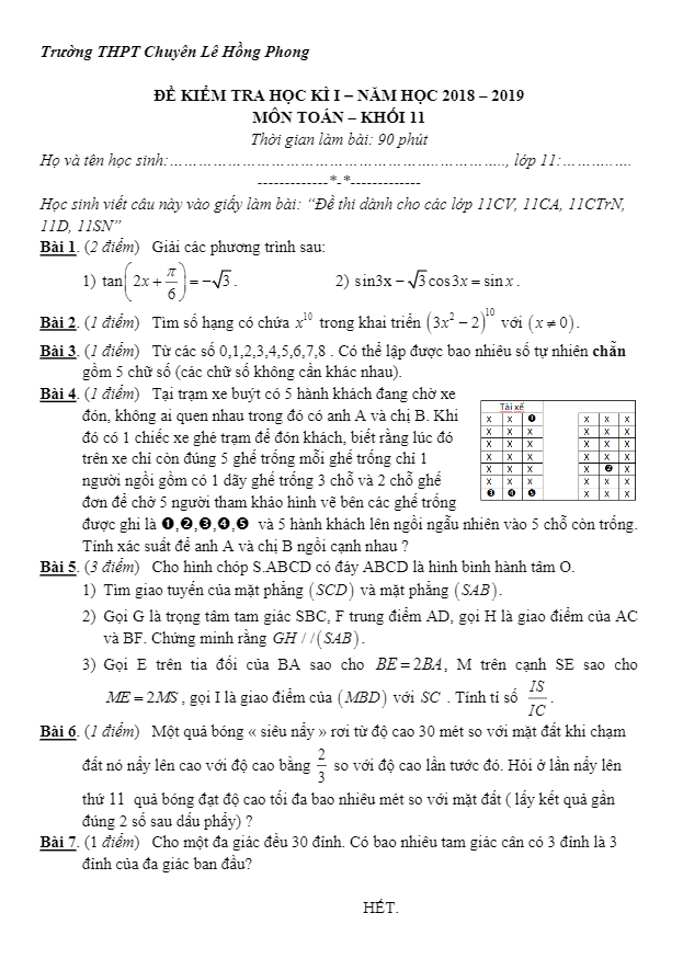 Đề Thi HK1 Toán 11 Đề thi HK1 Toán 11 năm 2018 – 2019 trường THPT chuyên Lê Hồng Phong – TP. HCM 16/12/2018