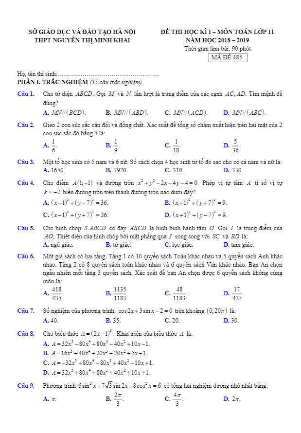 Đề Thi HK1 Toán 11 Đề thi HK1 Toán 11 năm học 2018 – 2019 trường THPT Nguyễn Thị Minh Khai – Hà Nội 19/12/2018