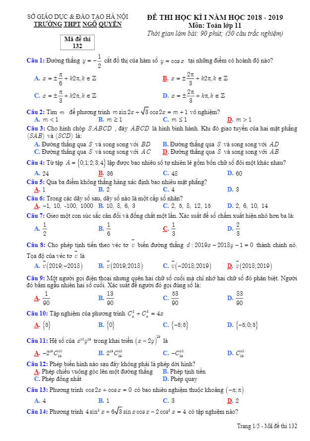 Đề Thi HK1 Toán 11 Đề thi học kỳ 1 Toán 11 năm học 2018 – 2019 trường THPT Ngô Quyền – Hà Nội 19/12/2018