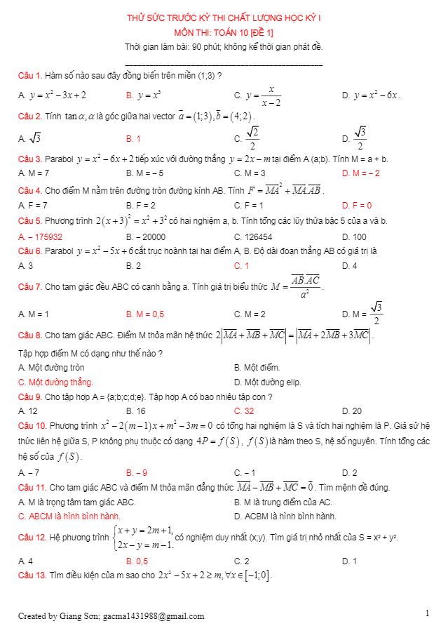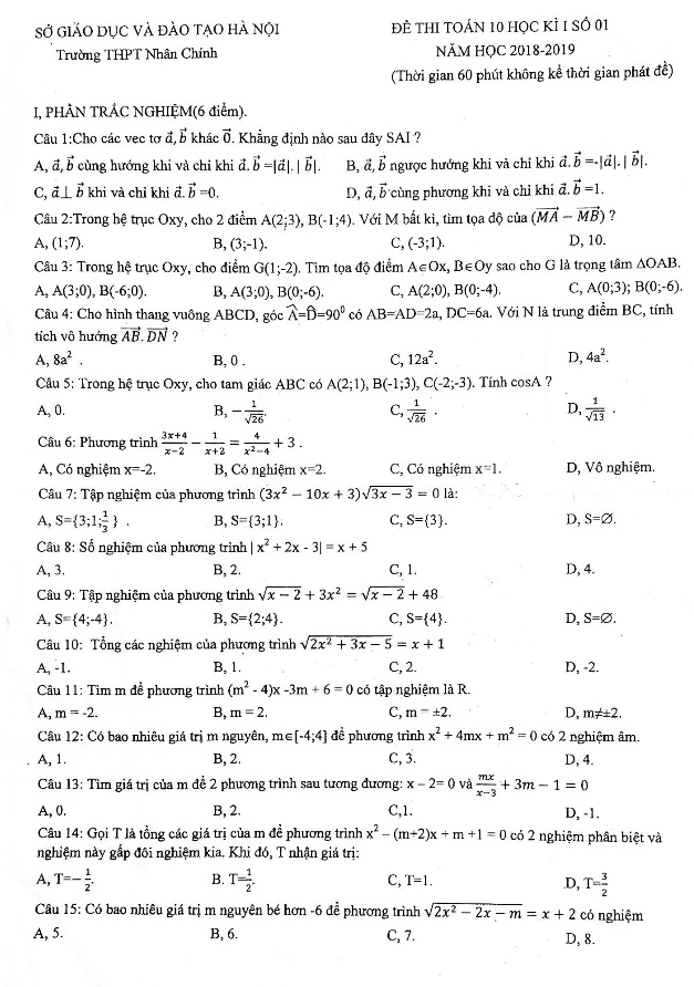 Đề Thi HK1 Toán 10 Đề thi Toán 10 học kỳ 1 năm 2018 – 2019 trường THPT Nhân Chính – Hà Nội 17/12/2018