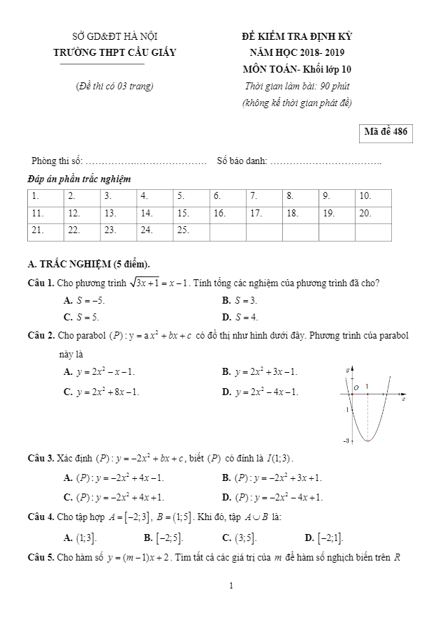 Đề Thi HK1 Toán 10 Đề kiểm tra định kỳ Toán 10 năm học 2018 – 2019 trường THPT Cầu Giấy – Hà Nội 12/12/2018