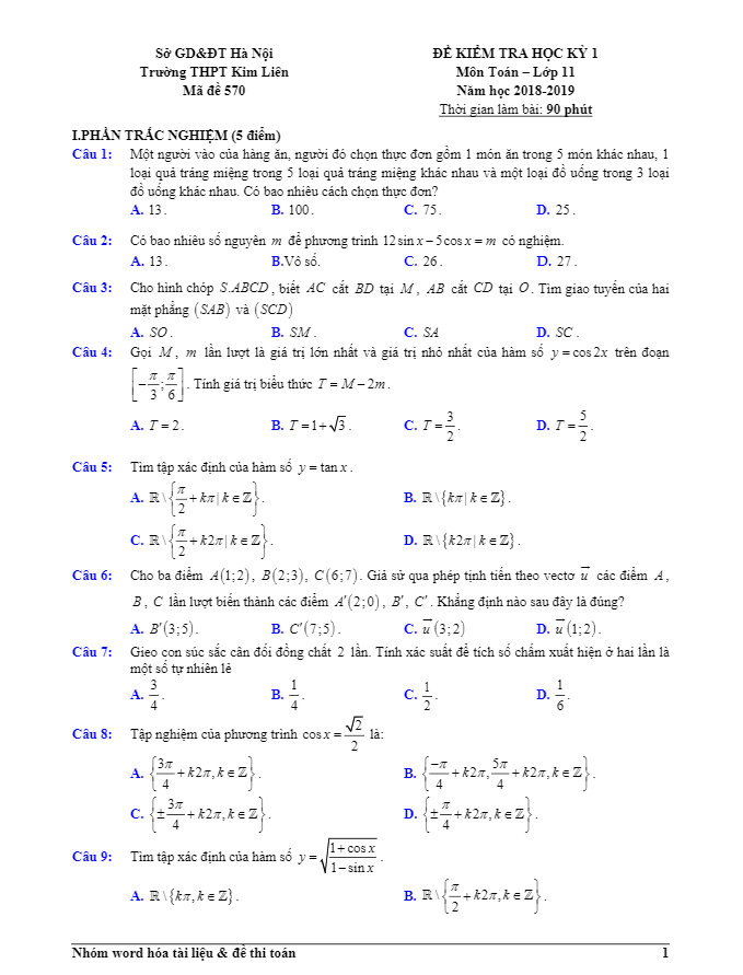 Đề Thi HK1 Toán 11 Đề kiểm tra học kỳ 1 Toán 11 năm học 2018 – 2019 trường THPT Kim Liên – Hà Nội 11/12/2018