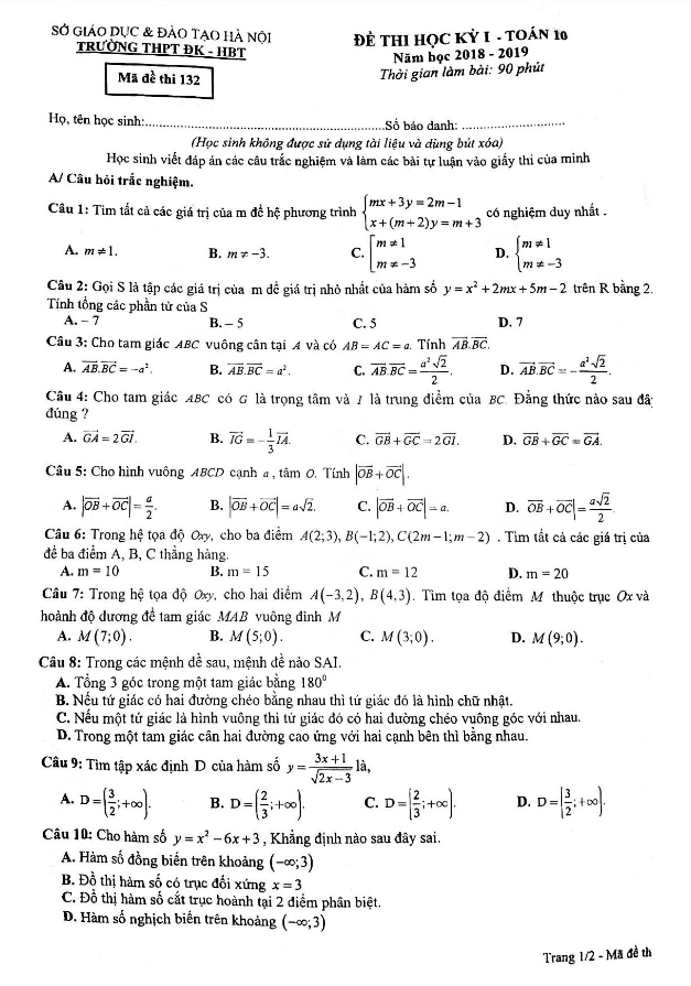 Đề Thi HK1 Toán 10 Đề thi học kỳ I Toán 10 năm 2018 – 2019 trường Đoàn Kết – Hai Bà Trưng – Hà Nội 10/12/2018