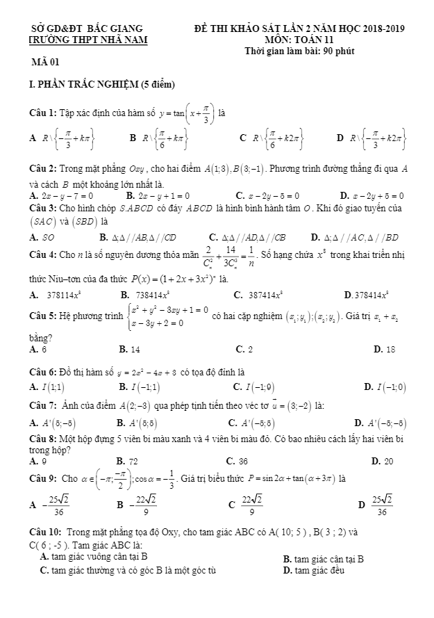 Khảo Sát Chất Lượng Toán 11 Đề thi khảo sát Toán 11 lần 2 năm 2018 – 2019 trường THPT Nhã Nam – Bắc Giang 12/12/2018