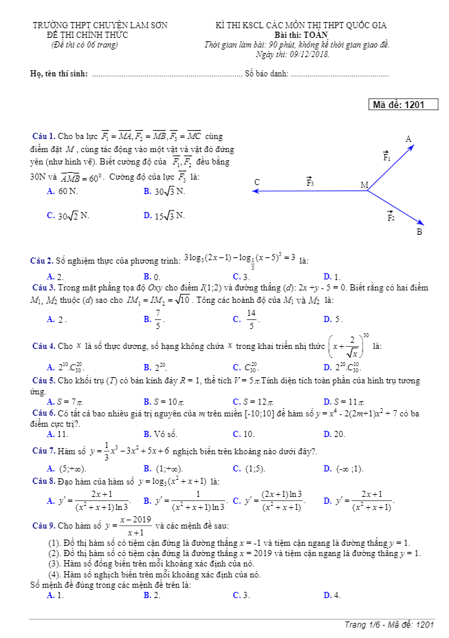 Đề Thi Thử THPT Môn Toán Đề thi KSCL Toán ôn thi THPT Quốc gia 2019 trường THPT chuyên Lam Sơn – Thanh Hóa 09/12/2018