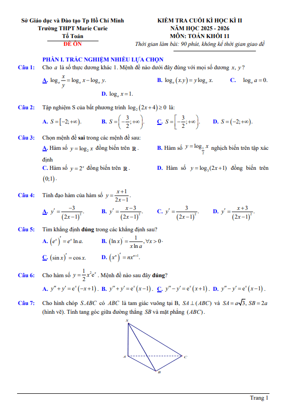Đề Thi HK1 Toán 11 Đề thi học kỳ 1 Toán 11 năm học 2018 – 2019 trường THPT Marie Curie – Hà Nội 08/12/2018