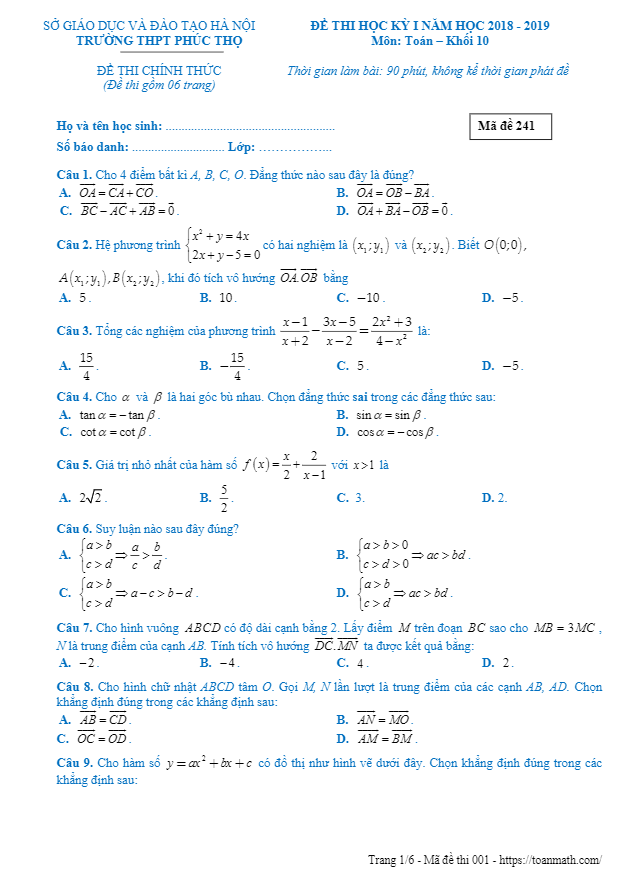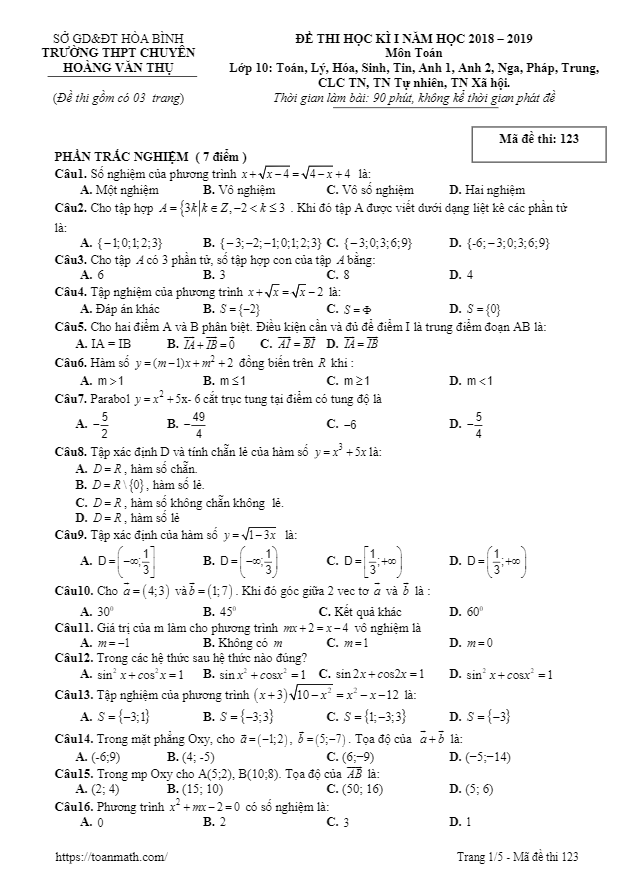 Đề Thi HK1 Toán 10 Đề thi HK1 Toán 10 năm 2018 – 2019 trường chuyên Hoàng Văn Thụ – Hòa Bình 08/01/2019