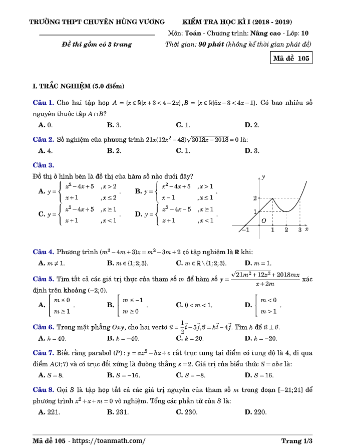 Đề Thi HK1 Toán 10 Đề thi HK1 Toán 10 năm 2018 – 2019 trường THPT chuyên Hùng Vương – Bình Dương 08/01/2019