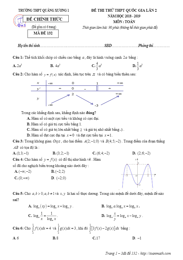 Đề Thi Thử THPT Môn Toán Đề thi thử Toán THPT Quốc gia 2019 lần 2 trường Quảng Xương 1 – Thanh Hóa 13/01/2019