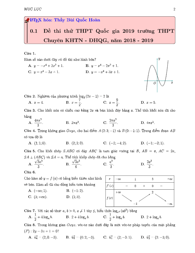 Đề Thi Thử THPT Môn Toán Đề thi thử Toán THPT Quốc gia 2019 trường THPT chuyên KHTN – Hà Nội 08/01/2019