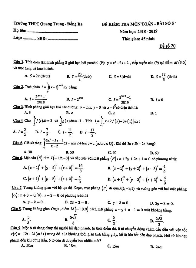 Khảo Sát Chất Lượng Toán 12 Đề kiểm tra Toán 12 bài số 5 năm 2018 – 2019 trường Quang Trung – Hà Nội 01/03/2019