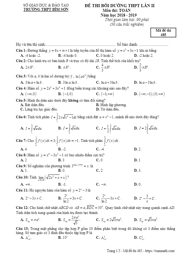 Đề Thi Thử THPT Môn Toán Đề thi bồi dưỡng THPT lần 2 môn Toán năm 2018 – 2019 trường Bỉm Sơn – Thanh Hóa 01/03/2019