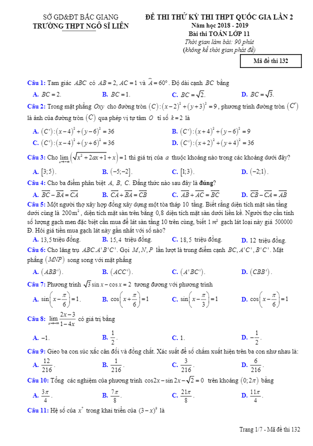 Khảo Sát Chất Lượng Toán 11 Đề thi thử Toán 11 THPTQG 2019 lần 2 trường Ngô Sĩ Liên – Bắc Giang 01/03/2019