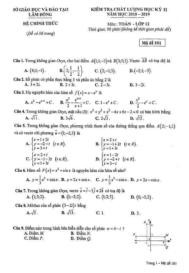 Đề Thi HK2 Toán 12 Đề thi HK2 Toán 12 năm học 2018 – 2019 sở Giáo dục và Đào tạo Quảng Trị 26/04/2019