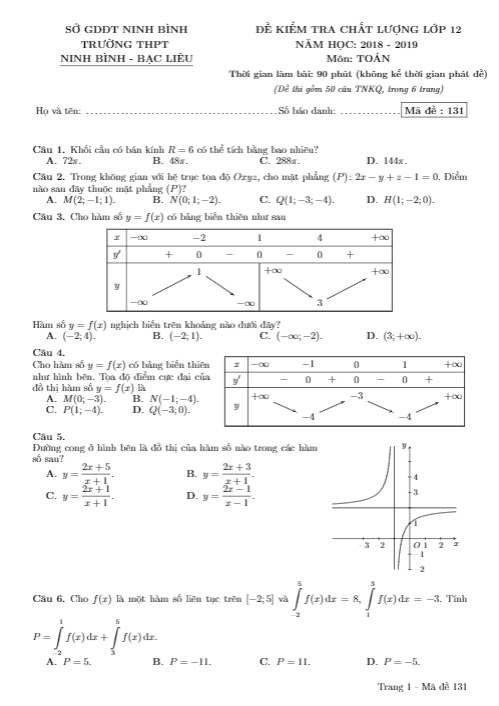 Đề Thi Thử THPT Môn Toán Đề kiểm tra Toán 12 năm 2018 – 2019 lần 4 trường Ninh Bình – Bạc Liêu – Ninh Bình 25/04/2019