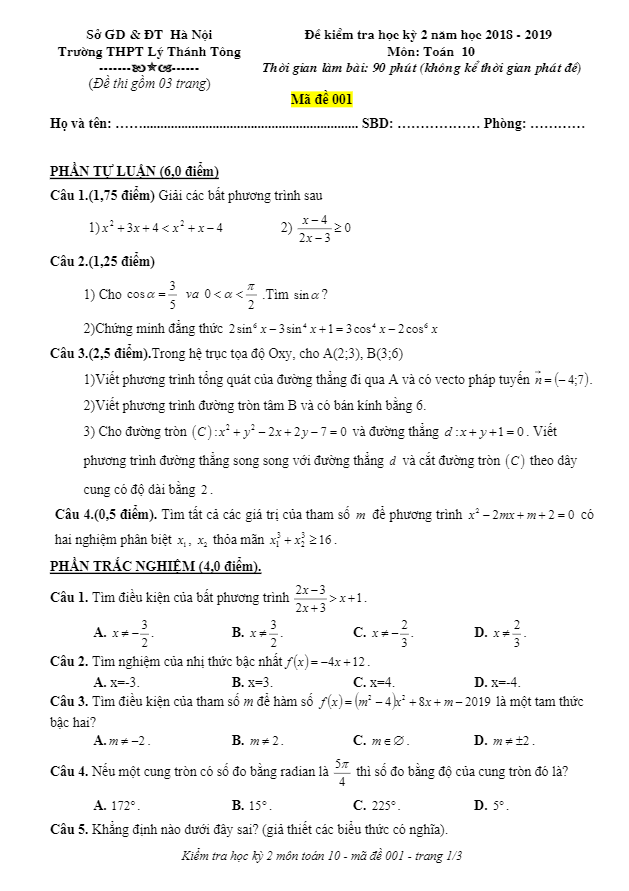 Đề Thi HK2 Toán 10 Đề thi học kỳ 2 Toán 10 năm 2018 – 2019 trường THPT chuyên Hà Nội – Amsterdam 27/04/2019