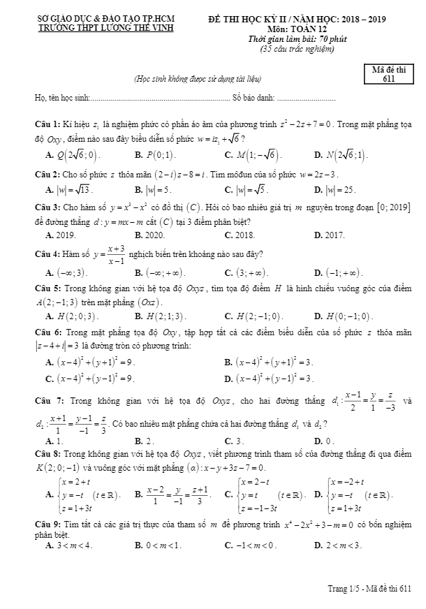 Đề Thi HK2 Toán 12 Đề thi HK2 Toán 12 năm 2018 – 2019 trường THPT Nguyễn Công Trứ – TP HCM 28/04/2019