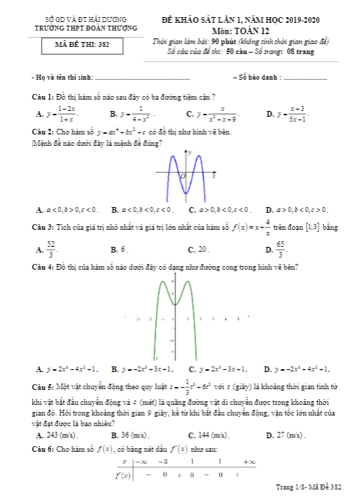 Đề Thi Thử THPT Môn Toán Đề khảo sát Toán 12 lần 1 năm 2019 – 2020 trường Đoàn Thượng – Hải Dương 12/09/2019