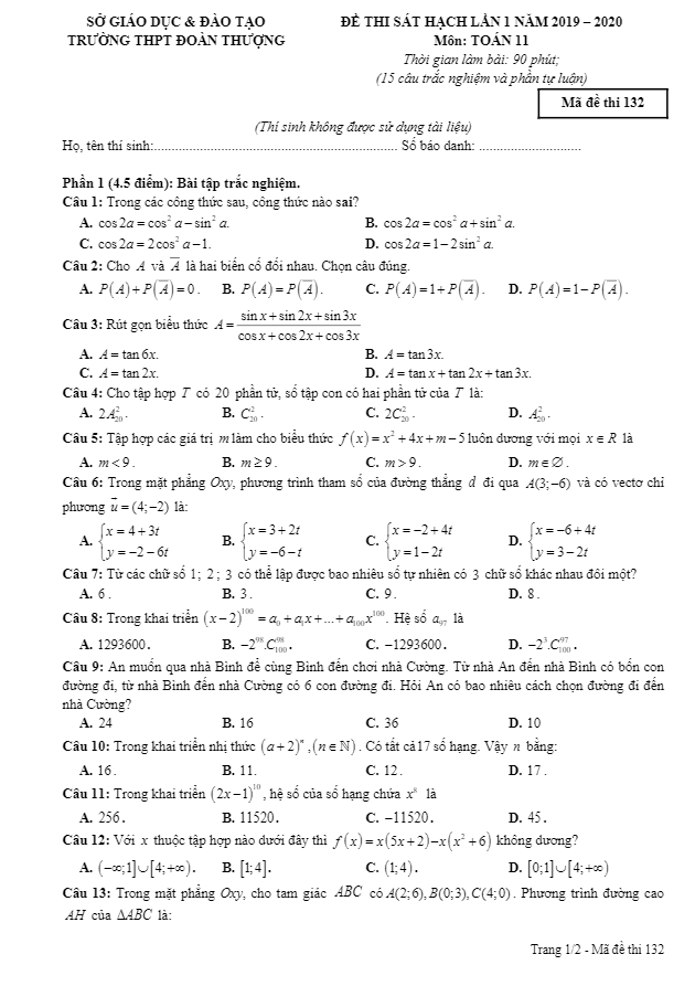 Khảo Sát Chất Lượng Toán 11 Đề thi sát hạch Toán 11 lần 1 năm 2019 – 2020 trường Đoàn Thượng – Hải Dương 12/09/2019