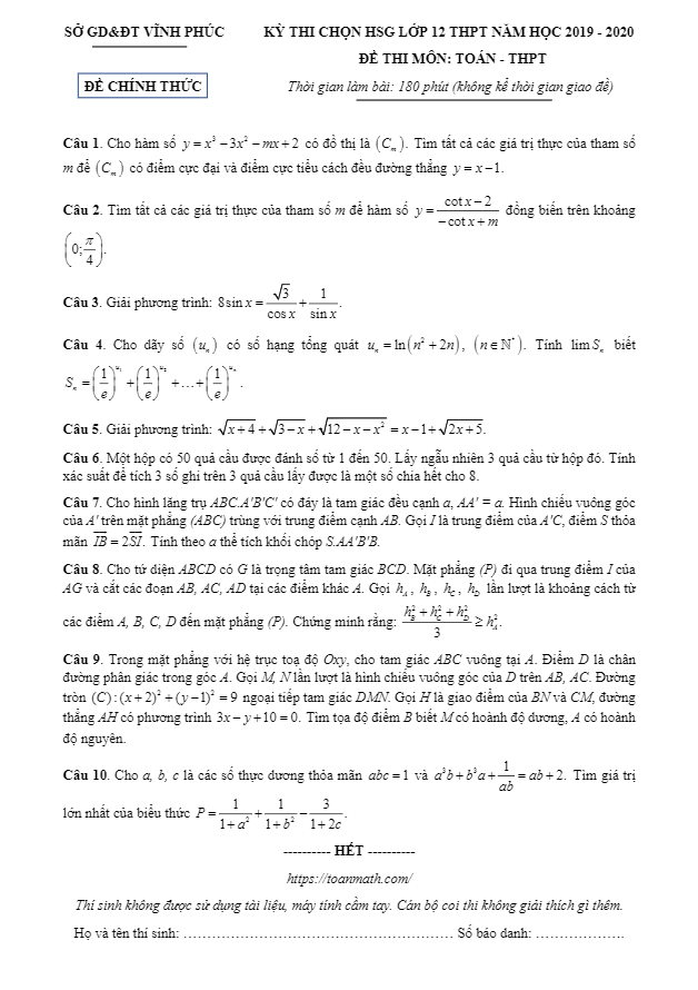 Đề Thi HK1 Toán 12 Đề thi học kì 1 Toán 12 năm 2019 – 2020 trường THPT Phạm Phú Thứ – TP HCM 29/11/2019