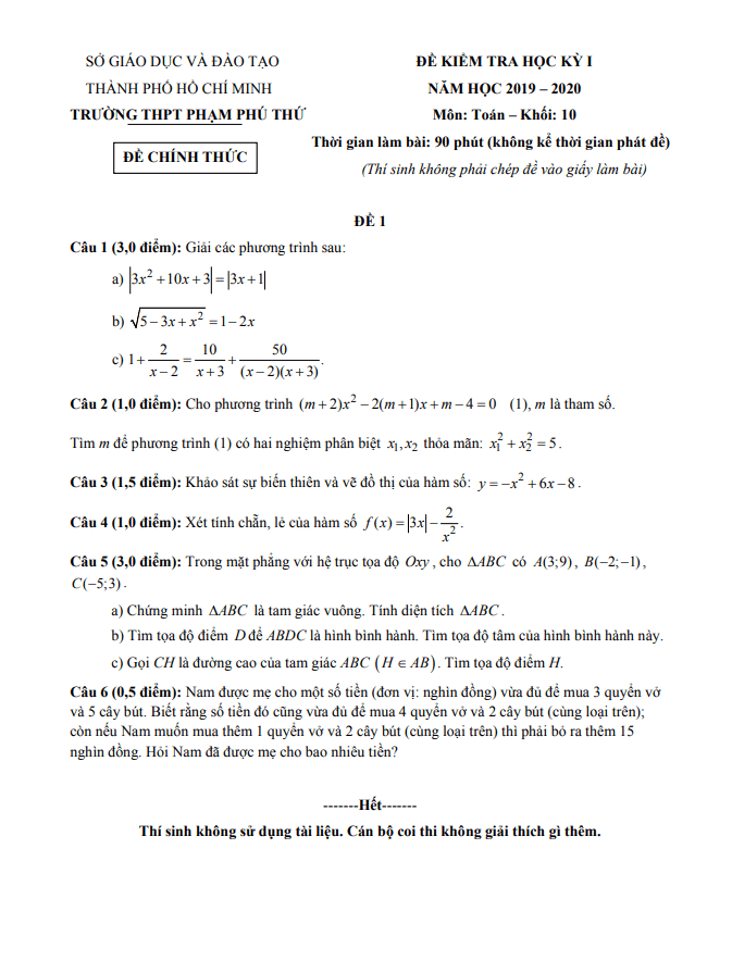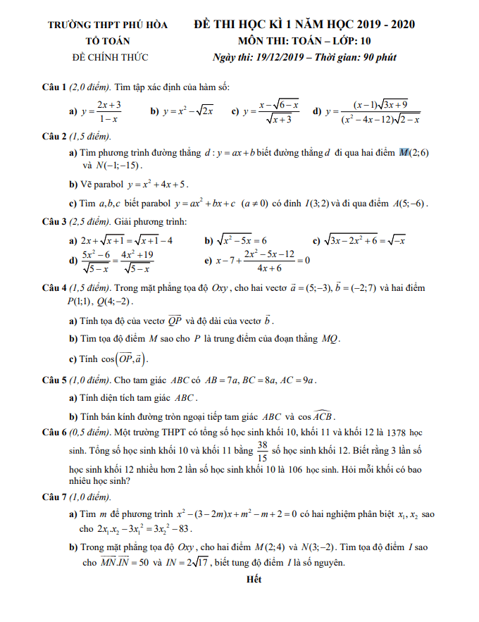 Đề Thi HK1 Toán 10 Đề thi học kì 1 Toán 10 năm 2019 – 2020 trường THPT Phạm Phú Thứ – TP HCM 29/11/2019