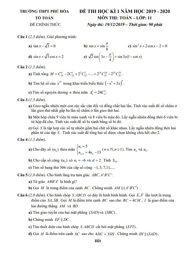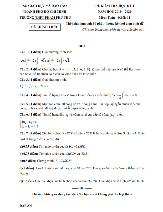 Đề Thi HK1 Toán 11 Đề thi học kì 1 Toán 11 năm 2019 – 2020 trường THPT Phạm Phú Thứ – TP HCM 29/11/2019