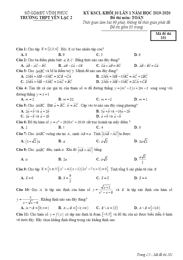 Khảo Sát Chất Lượng Toán 10 Đề KSCL Toán 10 lần 1 năm 2019 – 2020 trường THPT Yên Lạc 2 – Vĩnh Phúc 20/11/2019