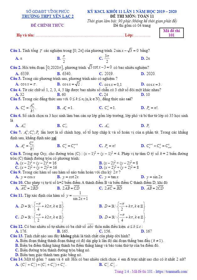 Khảo Sát Chất Lượng Toán 11 Đề KSCL Toán 11 lần 1 năm 2019 – 2020 trường THPT Yên Lạc 2 – Vĩnh Phúc 20/11/2019