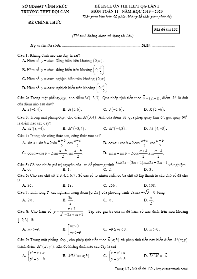 Khảo Sát Chất Lượng Toán 11 Đề KSCL Toán 11 lần 1 ôn thi THPTQG 2019 – 2020 trường Đội Cấn – Vĩnh Phúc 20/11/2019