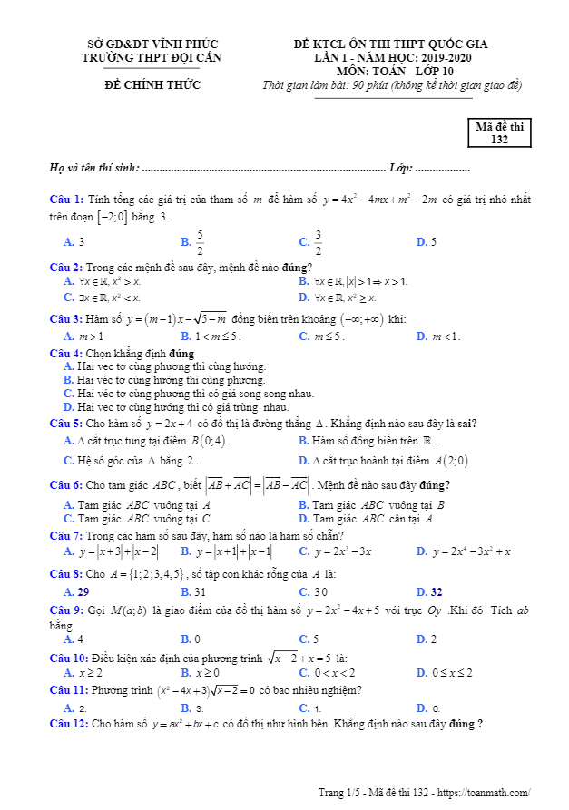 Khảo Sát Chất Lượng Toán 10 Đề KTCL Toán 10 lần 1 ôn thi THPTQG 2019 – 2020 trường Đội Cấn – Vĩnh Phúc 20/11/2019