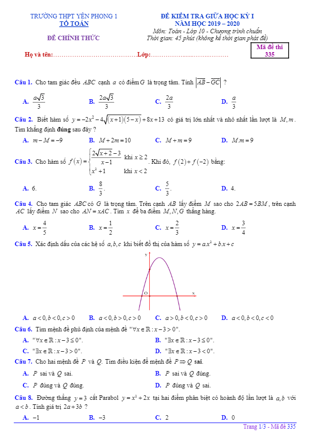 Đề kiểm tra giữa HK1 Toán 10 năm 2019 – 2020 trường Yên Phong 1 – Bắc Ninh