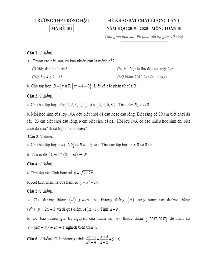 Đề KSCL Toán 10 lần 1 năm 2019 – 2020 trường THPT Đồng Đậu – Vĩnh Phúc